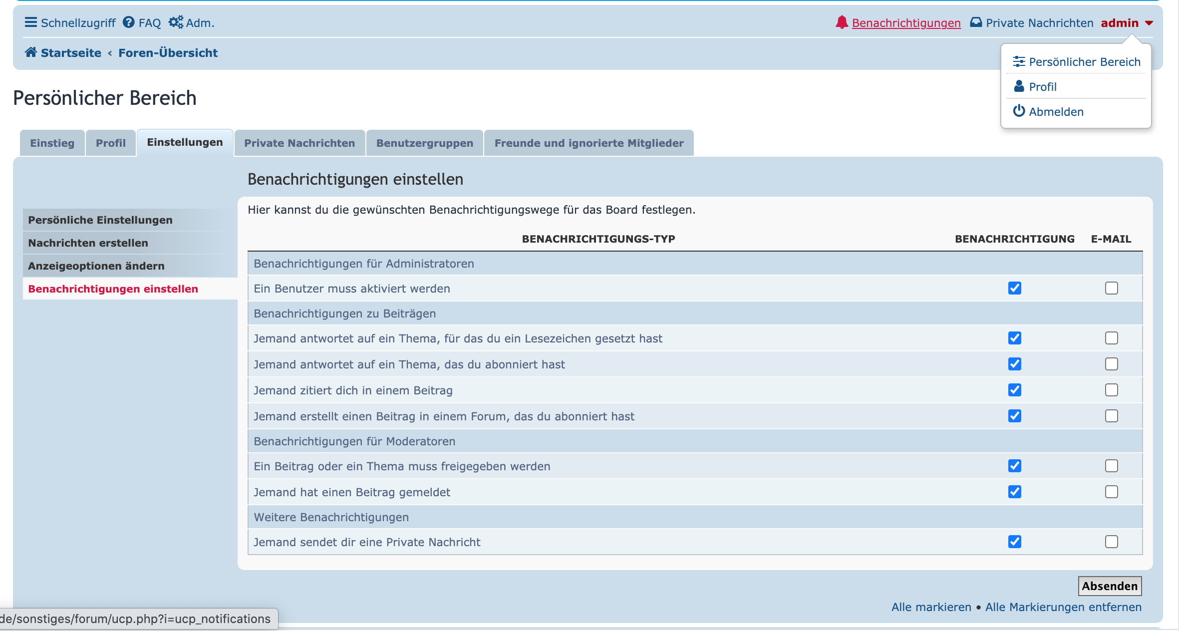 RZP hat geschrieben: 25.09.2020 12:48 Eine Frage noch: ich wollte automatisch E-Mails erhalten sobald im Forum neue Nachrichten geschrieben wurden (ggf. mit Einschränkungen je nach Thema). Irgendwie scheinen da meine Einstellungen jedoch nicht zu passen, denn über eure Nachrichten erhielt ich keine Info. Wo muss ich was wie einstellen, damit das korrekt klappt?